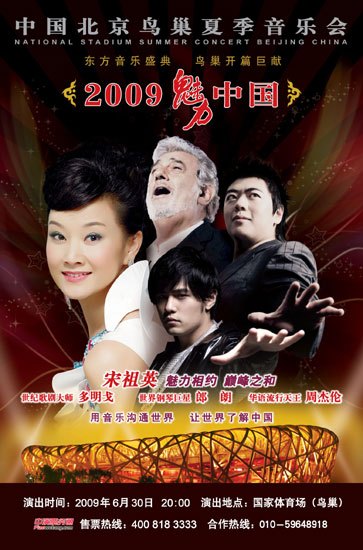 《2009魅力·中国鸟巢夏季音乐会》是鸟巢世界音乐盛事开篇之作,彰显中国魅力,是一场国际化的音乐盛事,它将推动中国民族音乐走向世界的进程,[1]也是世界乐坛最强实力艺术家联袂演出,民族、古典、流行三大音乐流派融会贯通,中西合璧,珠联璧合的音乐盛典!“中国最具实力民歌天后”宋祖英魅力相约三大嘉宾倾情共创巅峰之和:“华语乐坛流行天王”周杰伦,“古典钢琴世界巨星”郎朗,“世界著名三大男高音之一”多明戈,“英伦”组合再度携手,打造中国民歌“经典也流行”,世界钢琴大师郎朗重回鸟巢,为中国民族音乐加油,鸟巢变身成为世界最大的音乐殿堂,成为中国文化地标,中国三大交响乐团首次联合演出。